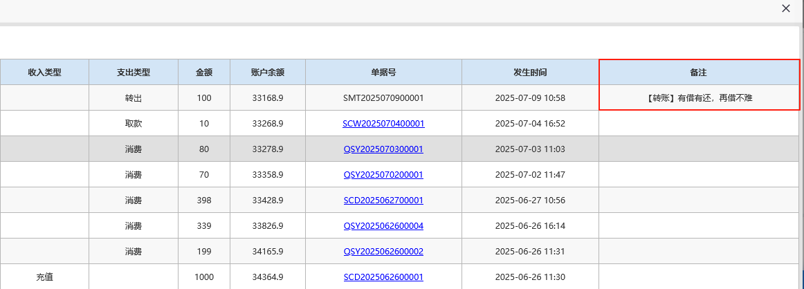 3.新增账户明细—备注,记录会员转账时的备注。