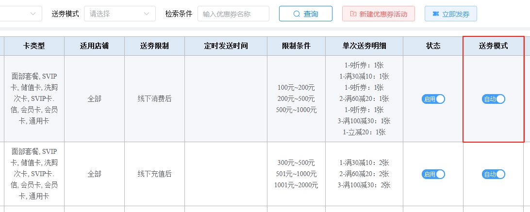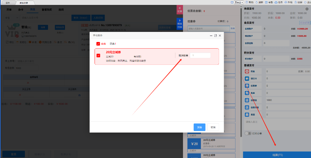 2.新增拓客--优惠券活动—送券模式。(送券模式为手动时,结算后弹出送券界面,可以手动修改送券数,不能超过设置的券数)